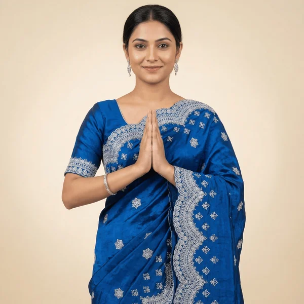 This elegant Bollywood-style royal blue fancy saree is designed to create a bold and graceful look. Featuring a rich royal blue base with delicate silver woven motifs, the saree is enhanced with an intricately crafted silver designer lace border that adds a luxurious and modern appeal. The lightweight and flowy fabric ensures a smooth drape, making it perfect for parties, receptions, and festive occasions. Inspired by Bollywood fashion trends, this saree is a perfect blend of traditional elegance and contemporary style.