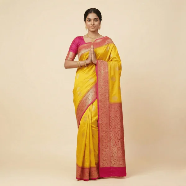This vibrant yellow Banarasi silk saree radiates festive charm and traditional elegance. The saree features a bright yellow base adorned with subtle zari motifs, paired with a rich pink zari woven border and intricately designed pallu. The striking yellow and pink combination makes it a perfect choice for haldi ceremonies, weddings, festivals, and special occasions. Crafted from premium silk-blend fabric, it offers a smooth texture and graceful drape for an elegant look.