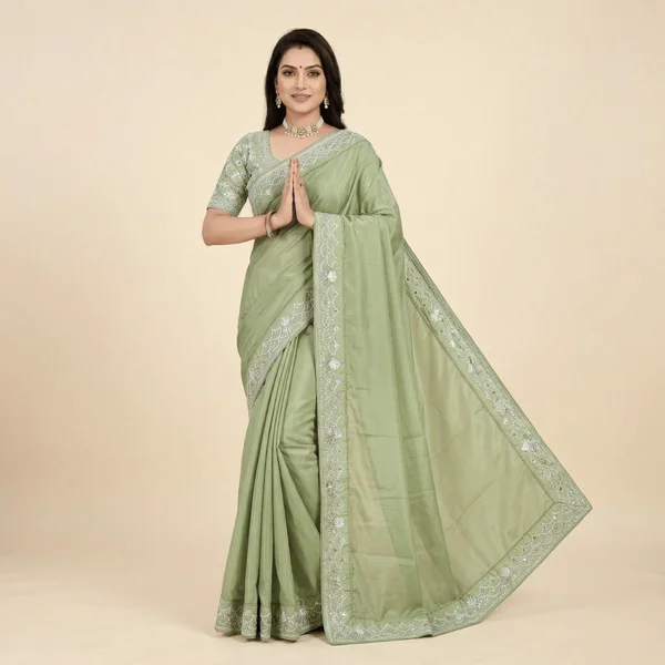 This elegant pastel green saree exudes grace with its minimalistic yet refined embroidery work along the border and pallu. The soft, soothing shade paired with delicate detailing makes it a perfect choice for women who prefer understated luxury. Crafted from smooth, lightweight fabric, this saree offers a fluid drape and all-day comfort. Ideal for daytime functions, formal gatherings, and elegant festive wear, it delivers a calm and sophisticated look.