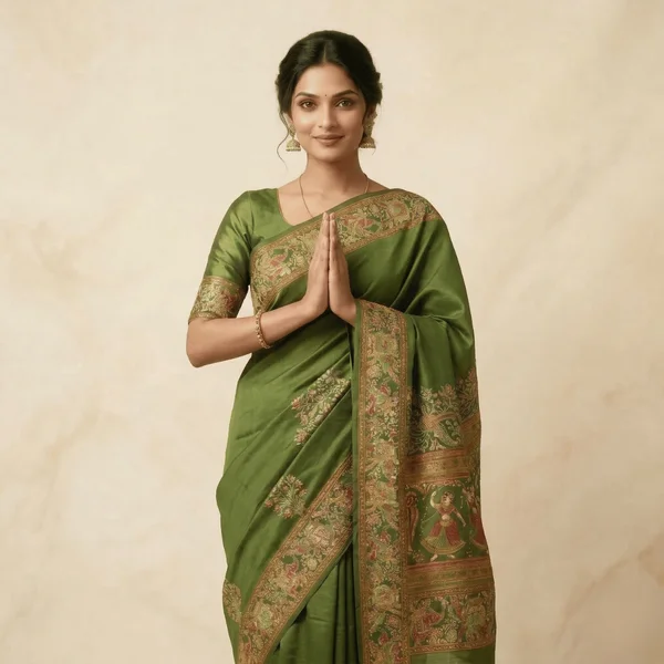 The Olive Green Classic Heritage Pashmina Saree features a subtle yet rich olive green tone complemented by finely woven traditional motifs. The saree is enhanced with a beautifully detailed heritage-style border and an elegant pallu showcasing intricate artistic patterns inspired by timeless Indian craftsmanship. Crafted from premium Pashmina fabric, this saree offers a smooth, soft texture and a graceful drape. The refined design and classic color make it a perfect choice for festive occasions, cultural gatherings, and traditional events.
