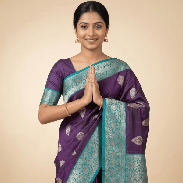 This elegant royal purple Banarasi silk saree showcases a rich and sophisticated look with finely woven zari motifs across the body. The saree is beautifully contrasted with a teal zari border and pallu, featuring intricate traditional patterns that enhance its luxurious appeal. Made from premium silk-blend fabric, it offers a smooth texture and graceful drape. The striking color combination of purple and teal makes it a perfect choice for festive occasions, weddings, and cultural events.