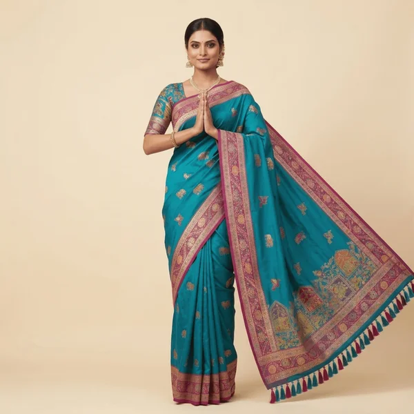 The Teal Pink Border Classic Pashmina Saree features a rich teal tone adorned with subtle woven motifs across the body. The saree is beautifully highlighted with a contrasting pink border and an intricately designed pallu showcasing traditional artistic patterns inspired by Indian heritage. Crafted from premium Pashmina fabric, the saree offers a soft texture and elegant drape. The vibrant color combination along with the detailed pallu and tassel accents adds a graceful and festive charm, making it perfect for weddings, celebrations, and cultural occasions.